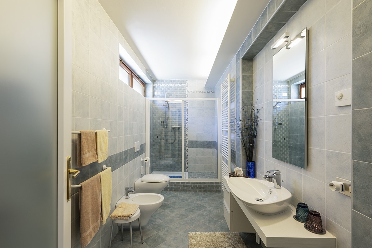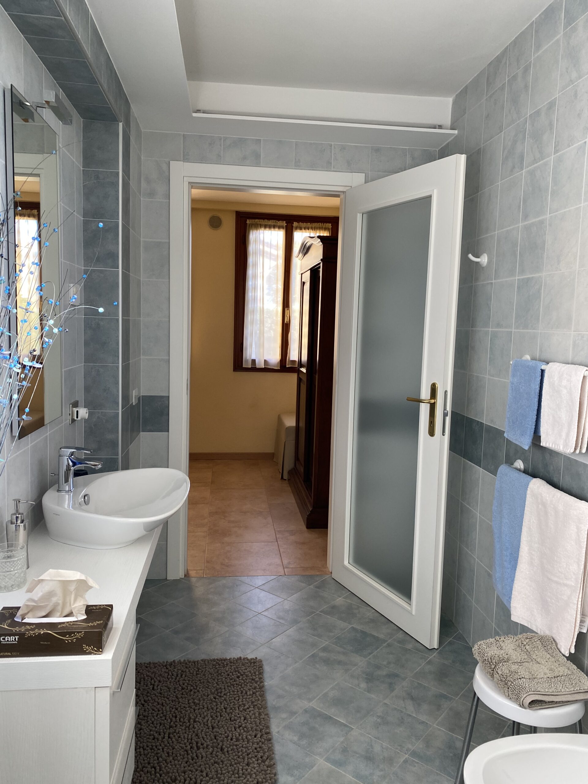 All’interno della camera c’è un ampio bagno (7 mq.) fornito di doccia spaziosa, lavandino, bidet e WC. All’interno del bagno troverete il set cortesia (cuffia doccia, shampoo doccia, set barba, set denti e vanity set per le signore).